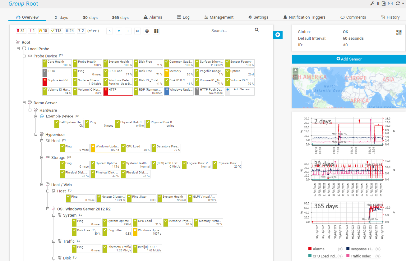 On each device, you can create a number of sensors. Every sensor monitors one single aspect of a device, for example: