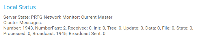 Shows internal summary information about the cluster node and the communication between the cluster nodes. You might be asked about this by the Paessler support team.